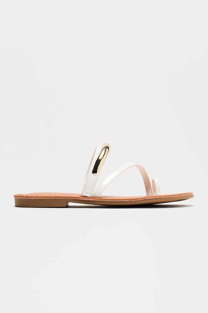 Available In Beige, Black And White. | Flat Sandals | Hardware Detail | Toe Ring Detail | Round Toe | Flat Heel | Imported
