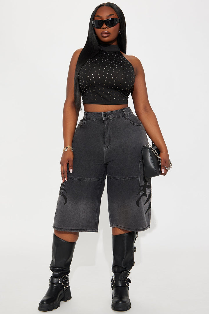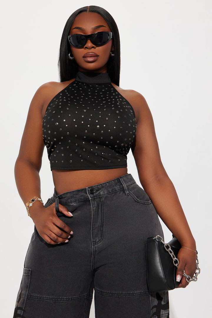 Available In Black. | Halter Top | Stretch | Button Closure Neck | Mock Neck | Hardware Detail | Backless | Tie Back | Cropped | Self: 95% Polyester 5% Spandex | Imported