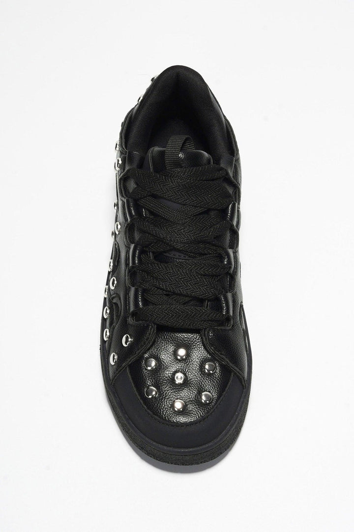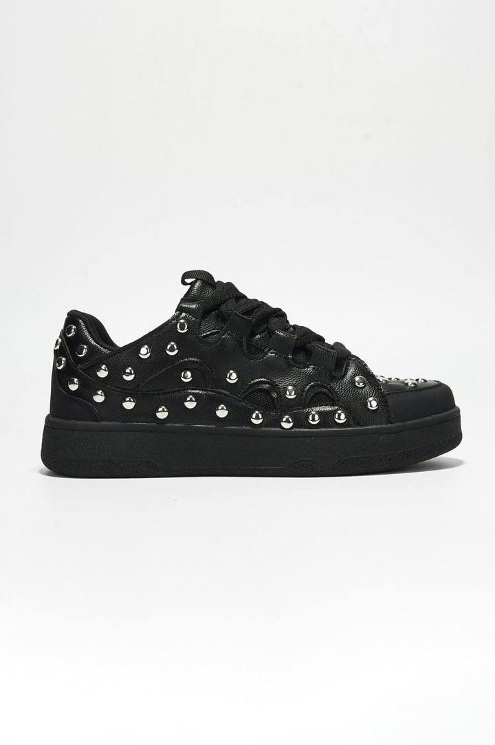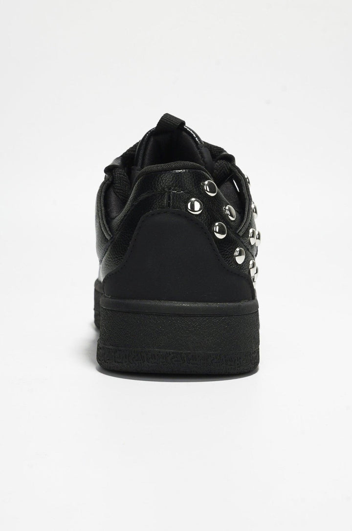 RANI - BLACK - SNEAKERS by CAPE ROBBIN Heel: 1 inch Lace-up Fabric insole with foam cushioning Studs Decorations Round toe The Rani Studded Sneakers are indeed a perfect blend of edgy design and casual chic. Their classic silhouette makes them versatile and easy to pair with a variety of outfits,whether you're running errands or meeting friends for coffee. The studded detailing adds a touch of glamour,making these sneakers a stylish choice for any occasion.