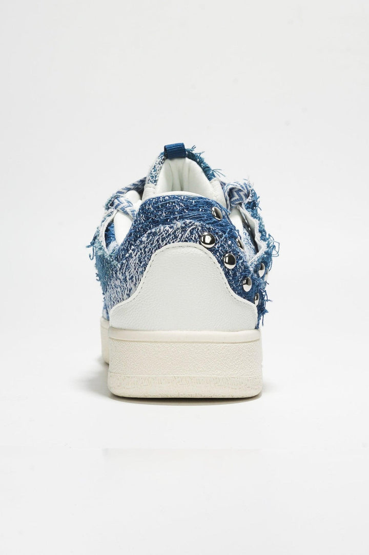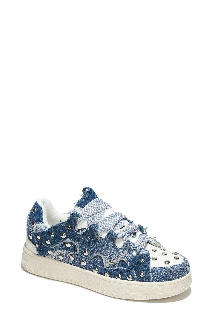 RANI - DENIM - SNEAKERS by CAPE ROBBIN Heel: 1 inch Lace-up Fabric insole with foam cushioning Studs Decorations Round toe The Rani Studded Sneakers are indeed a perfect blend of edgy design and casual chic. Their classic silhouette makes them versatile and easy to pair with a variety of outfits,whether you're running errands or meeting friends for coffee. The studded detailing adds a touch of glamour,making these sneakers a stylish choice for any occasion.