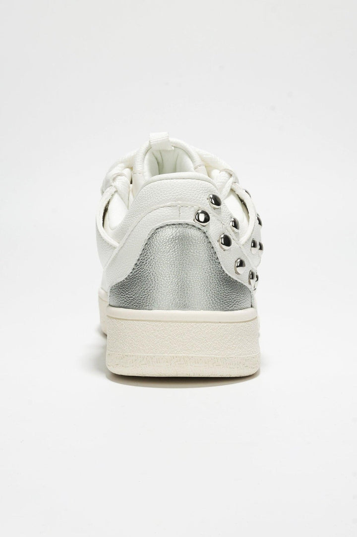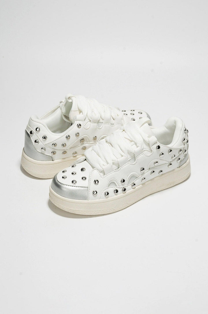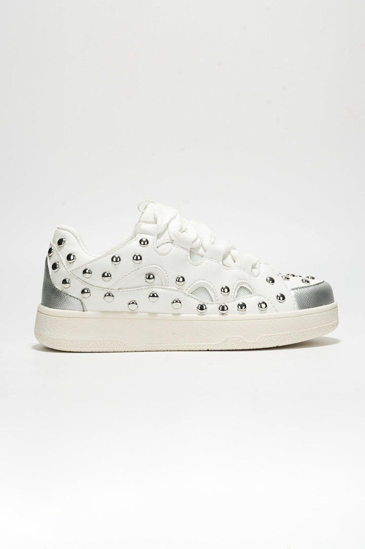 RANI - WHITE - SNEAKERS by CAPE ROBBIN Heel: 1 inch Lace-up Fabric insole with foam cushioning Studs Decorations Round toe The Rani Studded Sneakers are indeed a perfect blend of edgy design and casual chic. Their classic silhouette makes them versatile and easy to pair with a variety of outfits,whether you're running errands or meeting friends for coffee. The studded detailing adds a touch of glamour,making these sneakers a stylish choice for any occasion.