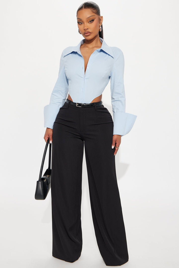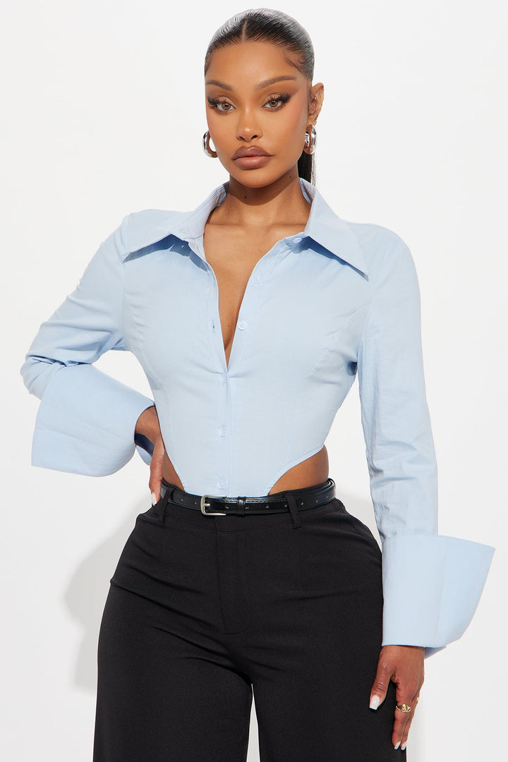 Available In Black, Blue And White. | Poplin High Cut Bodysuit | Button Front | Snap Button Closure | Non Stretch | Final Sale | Self: 97% Cotton 3% Spandex | Contrast: 95% Polyester 5% Spandex | Imported