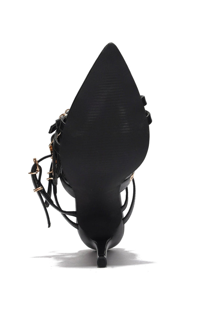 RASIA - BLACK - HEELS by CAPE ROBBIN open pointy toe lightly cushioned footbed rubber outsole loop trim PU denim Rasia will give you that extra edgy look with a splash of elegance! Features a dainty skinny high heel for a sophisticated vibe and multiple vamp straps with buckles for a trendy finish.