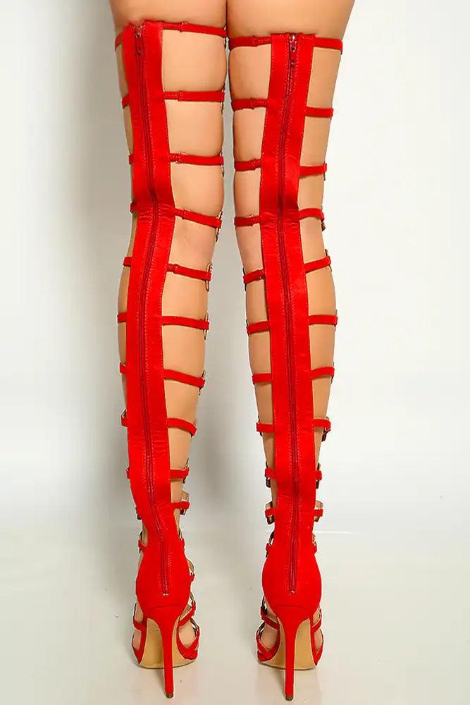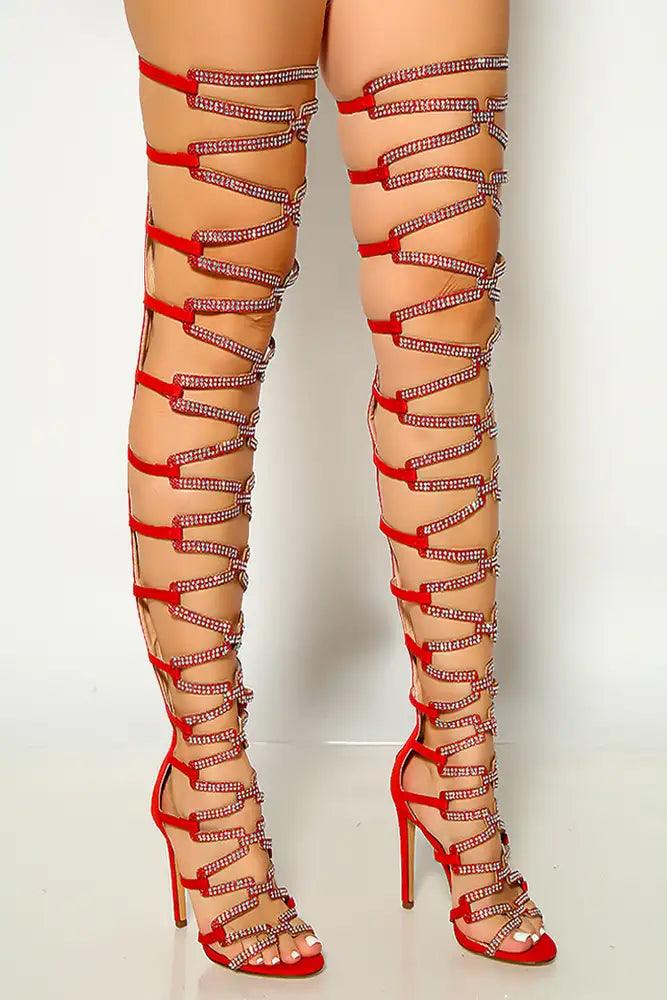 Red Open Toe Rhinestone Gladiator Thigh High High Heel