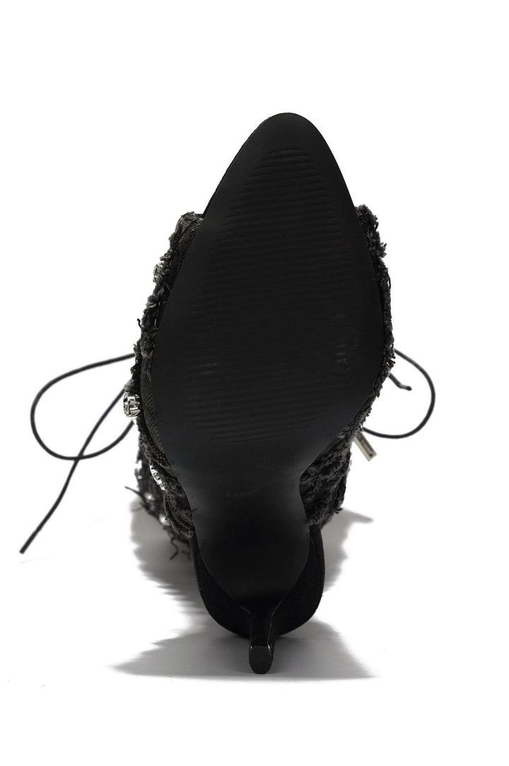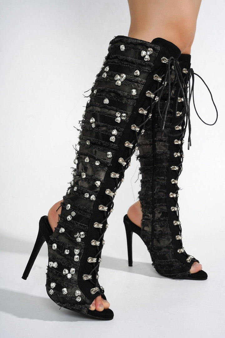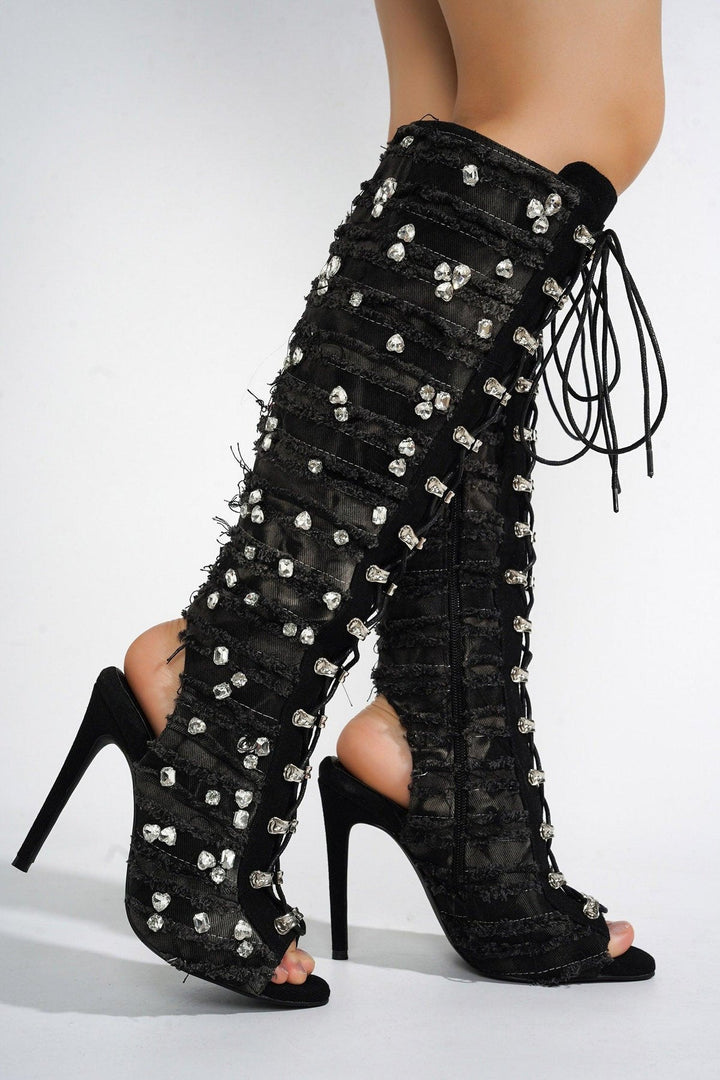 RENAISSANCEE - BLACK - BOOTS by CAPE ROBBIN open pointy toe lace-up fringe trim zipper closure rhinestone accent knee-high lightly cushioned footbed rubber outsole Cape Robbin's Renaissancee can do it all! They're chic,brilliant,and a tad bit rugged. This beauty,with its peep toe,stiletto heel,and open heel,is modern elegance personified while also elongating the legs for a sleek look. Pair with skirts or your favorite black leggings.