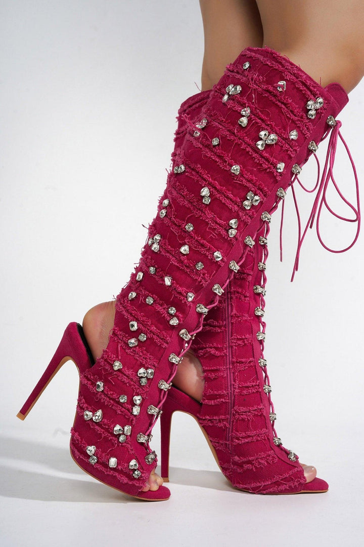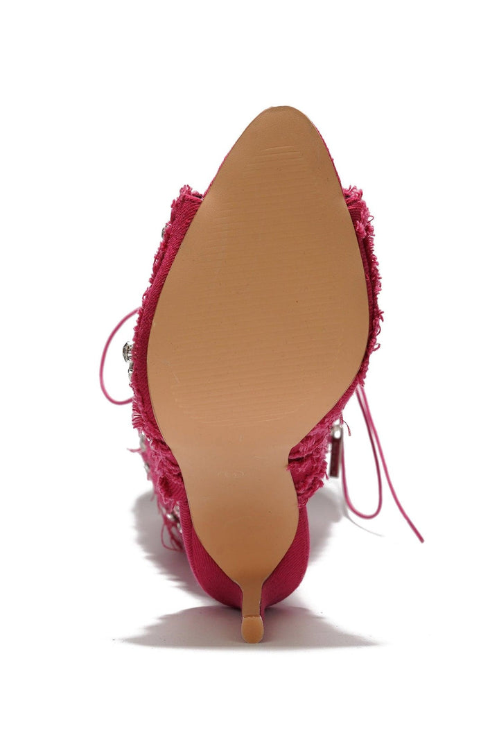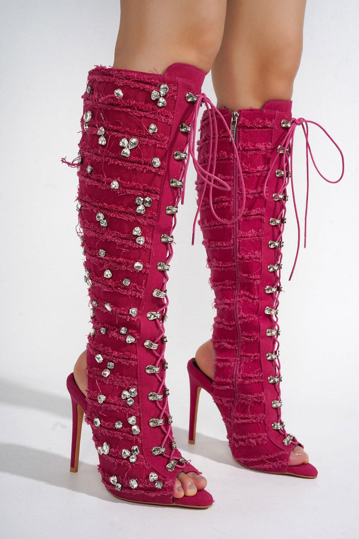 RENAISSANCEE - PINK - BOOTS by CAPE ROBBIN open pointy toe lace-up fringe trim zipper closure rhinestone accent knee-high lightly cushioned footbed rubber outsole Cape Robbin's Renaissancee can do it all! They're chic,brilliant,and a tad bit rugged. This beauty,with its peep toe,stiletto heel,and open heel,is modern elegance personified while also elongating the legs for a sleek look. Pair with skirts or your favorite black leggings.
