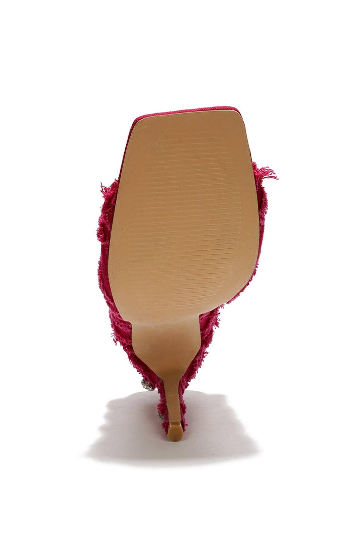REVOLT - PINK - HEELS by CAPE ROBBIN square toe distressed denim finish PU skinny heels lightly cushioned footbed embellishment rubber outsole Revolt is tailored for you to let the good times roll! Features delicate stiletto high heels for a powerful presence,a fringe and gem trim for an edgy,stylish vibe,and a gorgeous peep toe for a relaxed,breathable feel.
