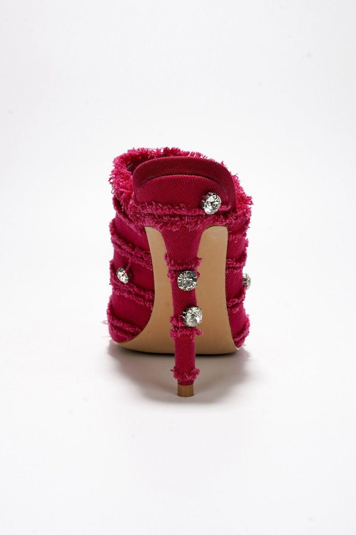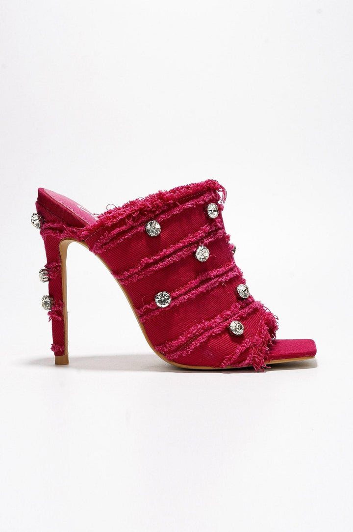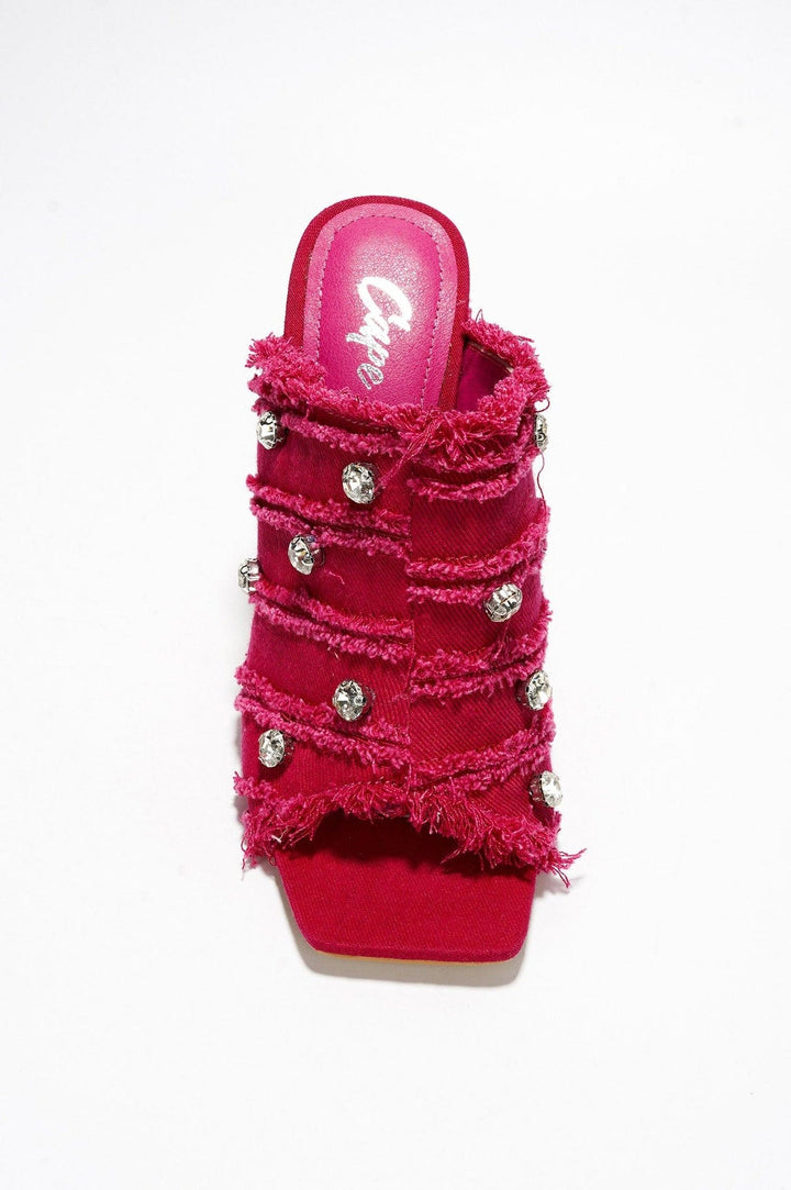 REVOLT - PINK - HEELS by CAPE ROBBIN square toe distressed denim finish PU skinny heels lightly cushioned footbed embellishment rubber outsole Revolt is tailored for you to let the good times roll! Features delicate stiletto high heels for a powerful presence,a fringe and gem trim for an edgy,stylish vibe,and a gorgeous peep toe for a relaxed,breathable feel.