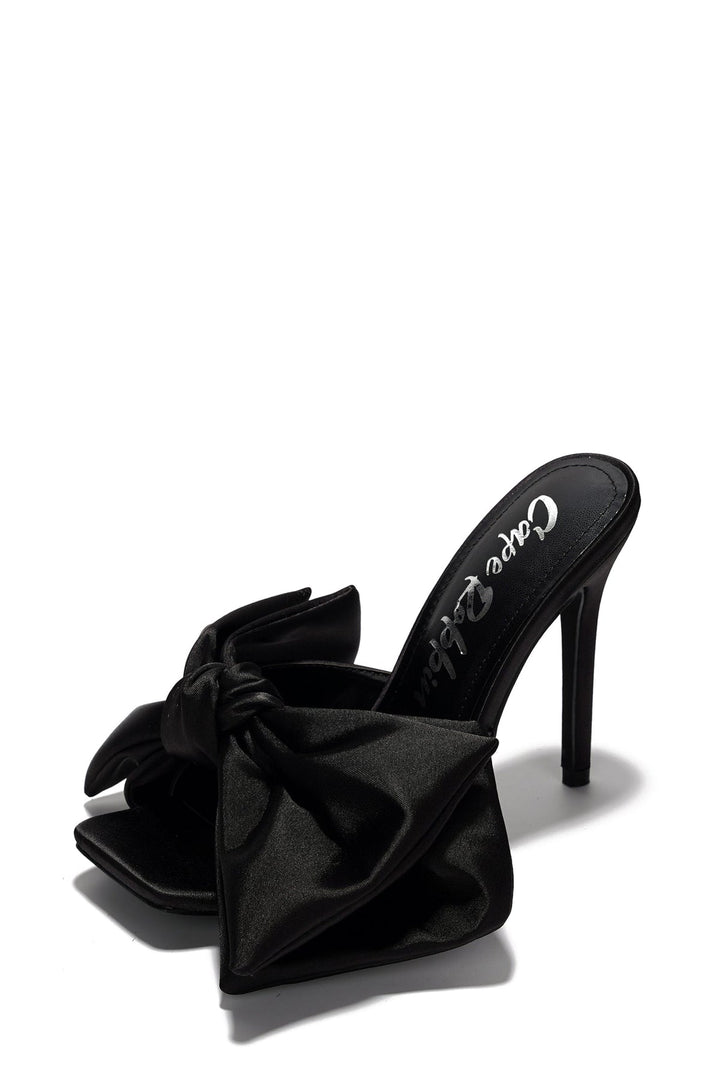 RHIANNA - BLACK - HEELS by CAPE ROBBIN Stiletto Heel: 4.25 inch Slip on Heeled Sandals PU leather insole with memory foam cushioning for added comfort Oversized bow Square toe Elevate your style with Rhianna chic high heel sandals,featuring an elegant satin or trendy denim finish,and an oversized bow detail. Perfect for parties and special occasions,these versatile stiletto heels offer comfort and sophistication.