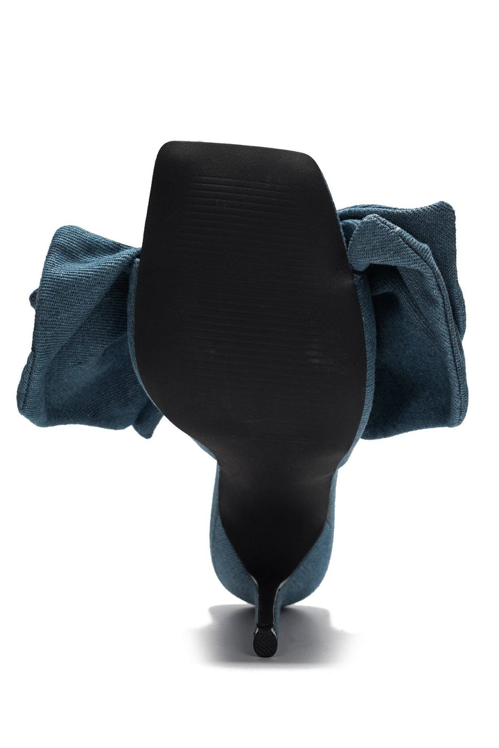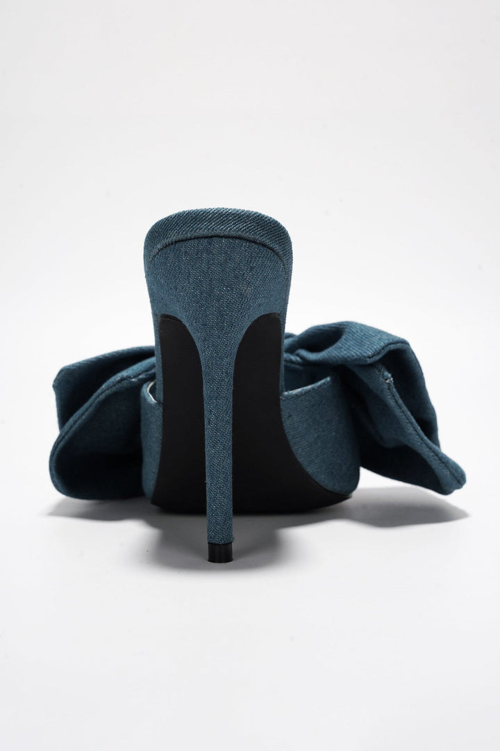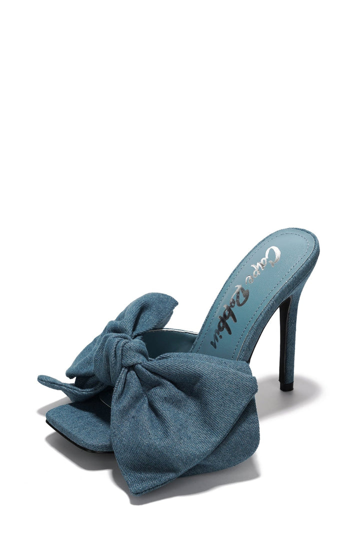RHIANNA - DENIM - HEELS by CAPE ROBBIN Stiletto Heel: 4.25 inch Slip on Heeled Sandals PU leather insole with memory foam cushioning for added comfort Oversized bow Square toe Elevate your style with Rhianna chic high heel sandals,featuring an elegant satin or trendy denim finish,and an oversized bow detail. Perfect for parties and special occasions,these versatile stiletto heels offer comfort and sophistication.