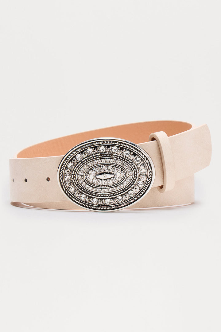 Available In Burgundy And Ivory. | Rhinestone Buckle Detail | Faux Leather Material | Length: 43" | 100% Polyurethane | Imported
