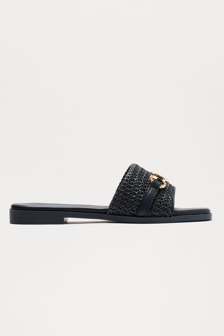 Available In Black And Natural. | Flat Sandals | Raffia Strap | Hardware Detail | Square Toe | Flat Heel | Imported