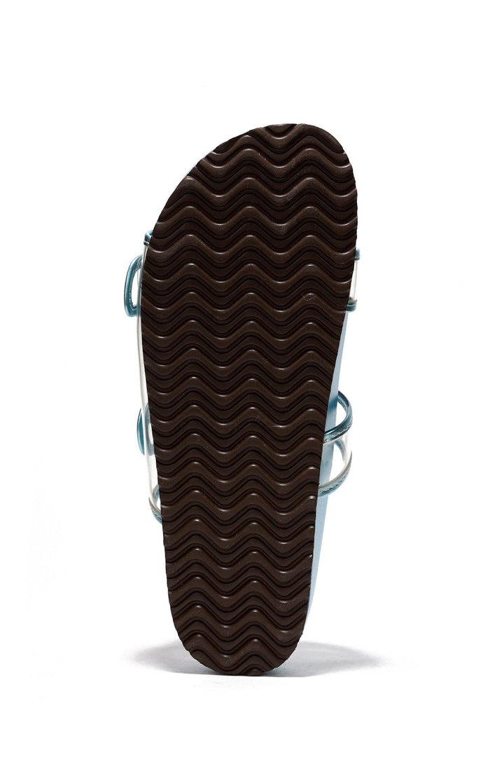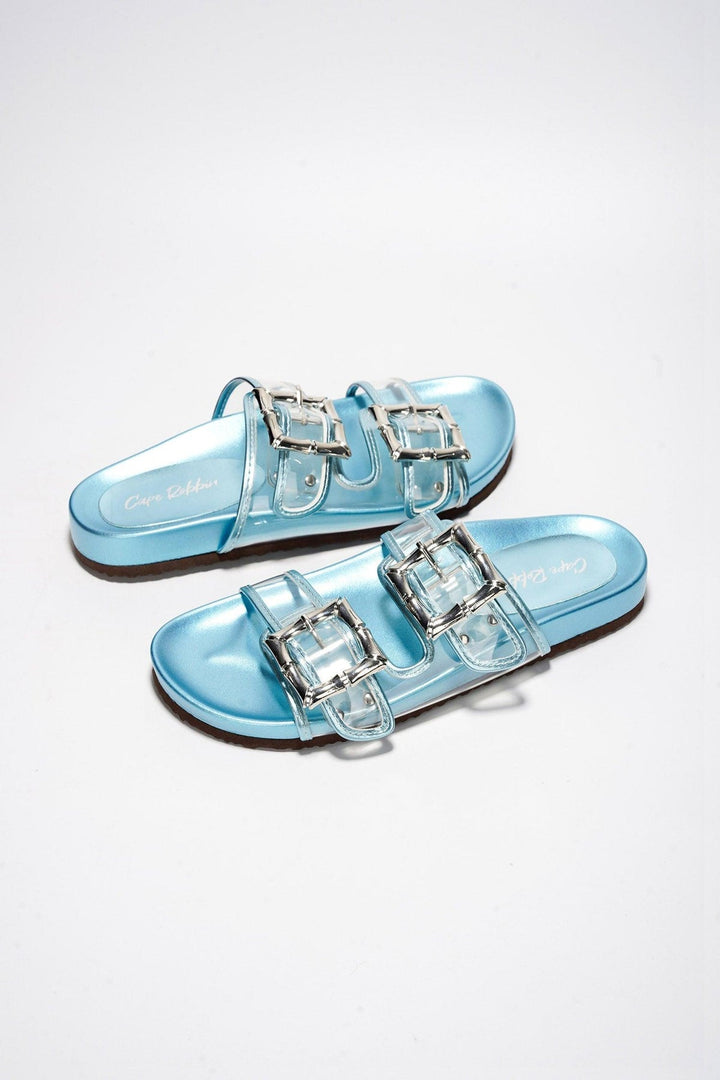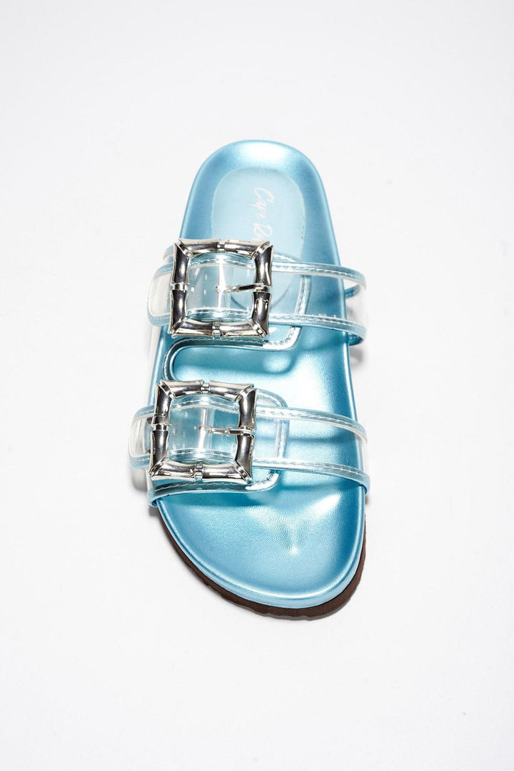 RICA - BLUE - SANDALS by CAPE ROBBIN contoured footbed PU open round toe TPU vamp straps rubber outsole Stay on-trend in these warm-weather-ready sandals! Rica slides feature a classic,stylish silhouette for a timeless vibe,a unique buckle design for an unmistakable look,and a metallic finish for a beautiful shimmer.