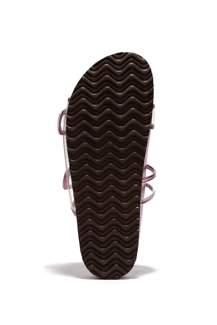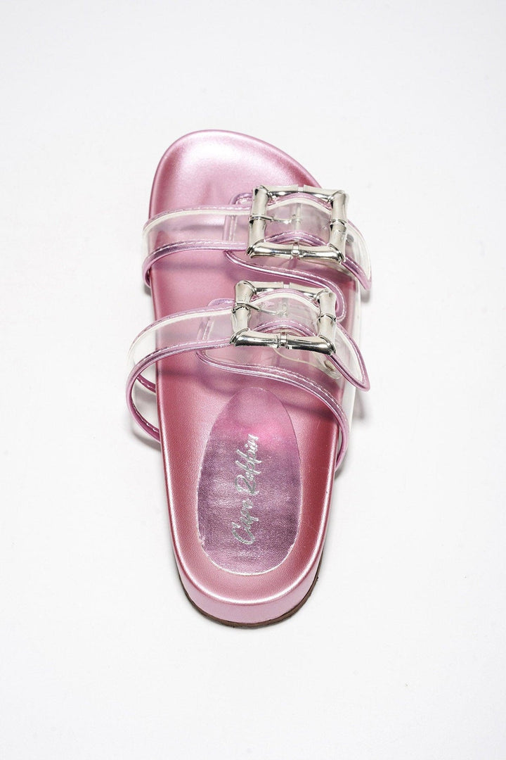 RICA - PINK - SANDALS by CAPE ROBBIN contoured footbed PU open round toe TPU vamp straps rubber outsole Stay on-trend in these warm-weather-ready sandals! Rica slides feature a classic,stylish silhouette for a timeless vibe,a unique buckle design for an unmistakable look,and a metallic finish for a beautiful shimmer.