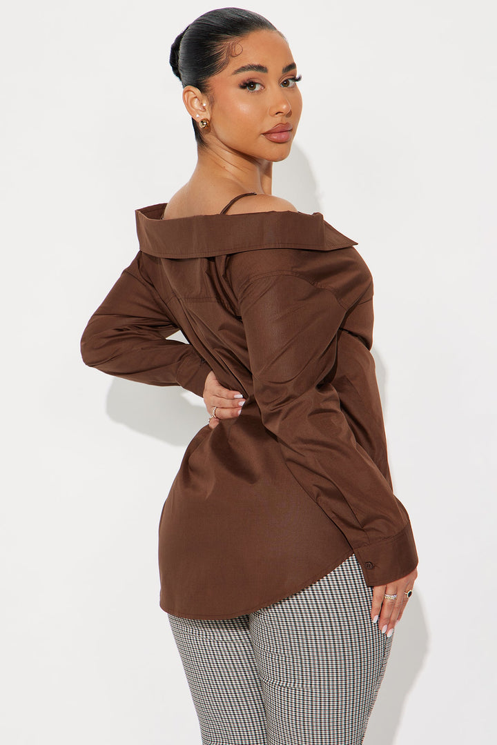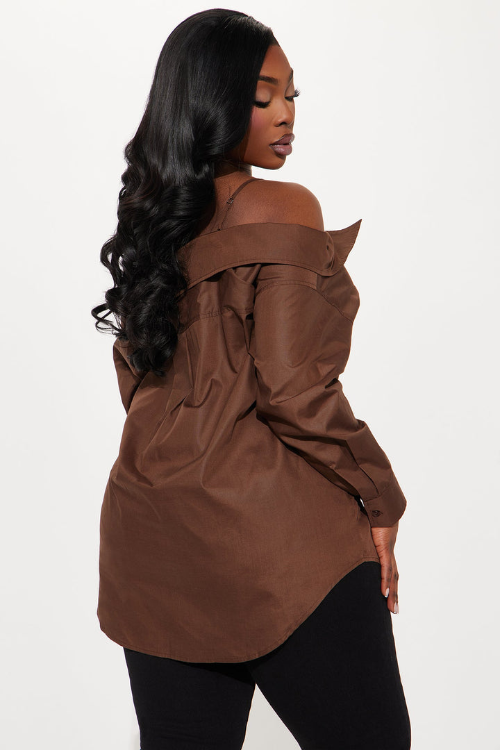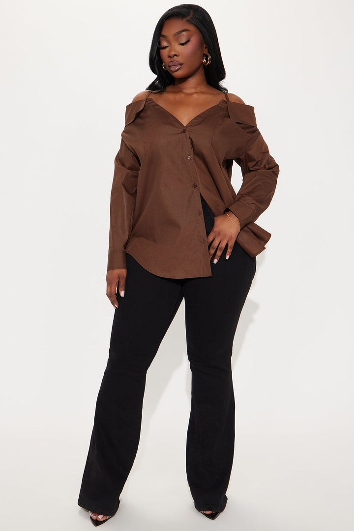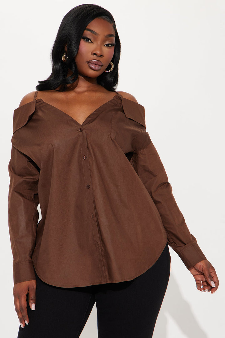 Available In Black, Chocolate And White. | Poplin Shirt | Long Sleeve | Off Shoulder | Fold Over Detail | Adjustable Straps | Button Down | Front Pocket | Non Stretch | Self: 65% Polyester 35% Cotton | Imported