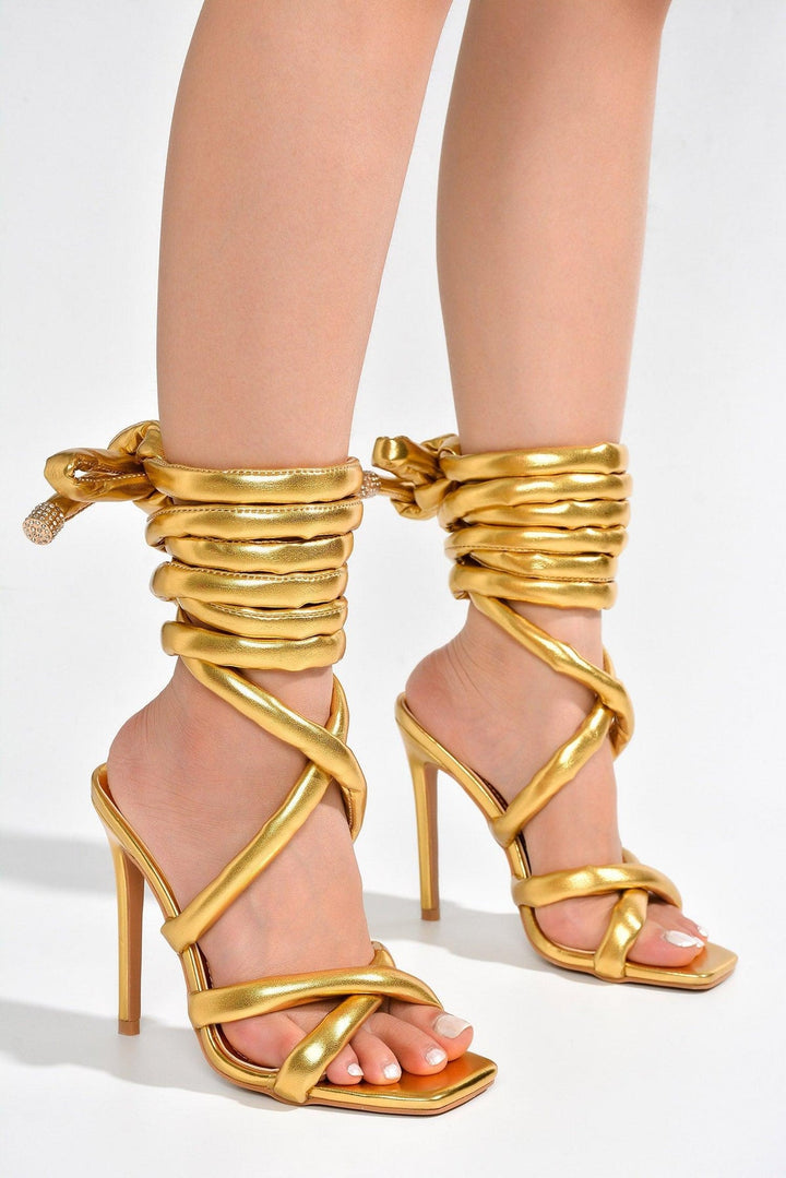 ROBERTA - GOLD - HEELS by CAPE ROBBIN ankle wrap rhinestone metallic PU skinny high heels square toe These Roberta ankle wrap heels will be the star of the night! With their metallic finish and rhinestone accents,they will have you feeling glamorous instantly.