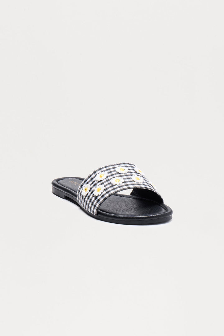 Available In Black/combo, Blue/combo And Pink/combo. | Flat Sandals | Gingham Print | Flower Detail | Round Toe | Flat Heel | Imported