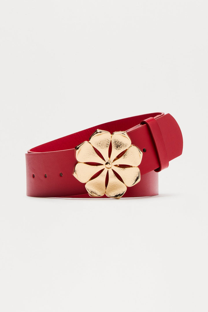 Available In Red. | Faux Leather Belt | Floral Buckle Detail | Length: 40" | Imported