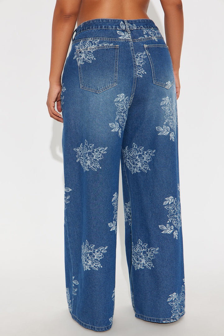 Rose Kiss Floral Print Wide Leg Jeans - Medium Wash