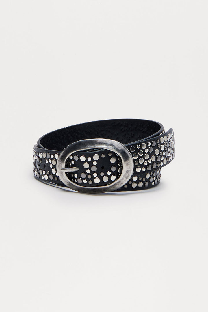 Available In Black. | Faux Leather Material | All Over Studded Detail | Circular Shape Buckle | 100% Polyurethane | Imported