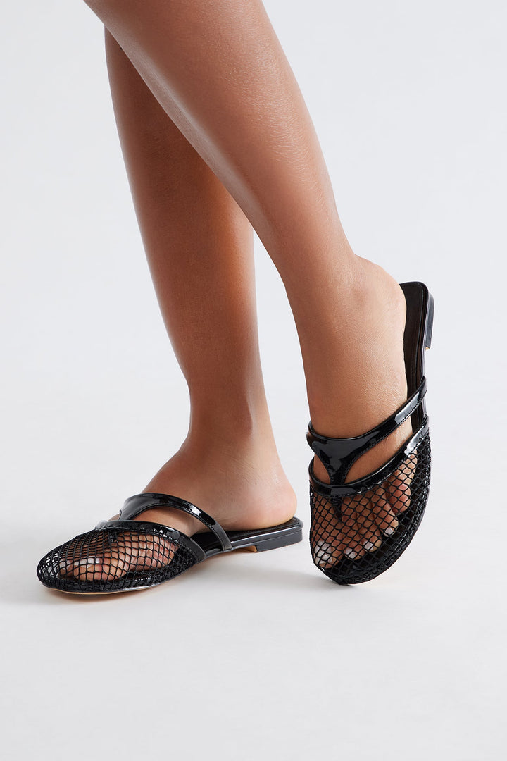 Available In Black And Burgundy. | Flat Sandals | Flip Flops | Fishnet Toe Detail | Round Toe | Flat Heel | Imported