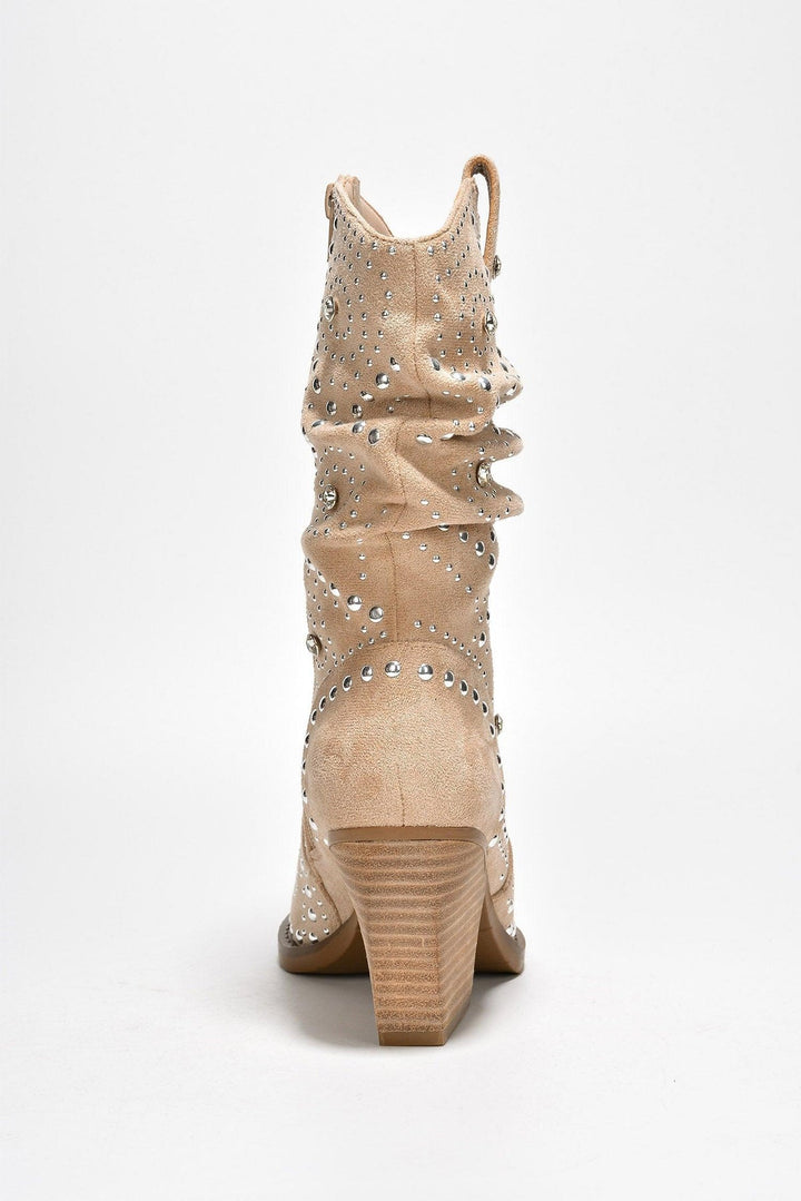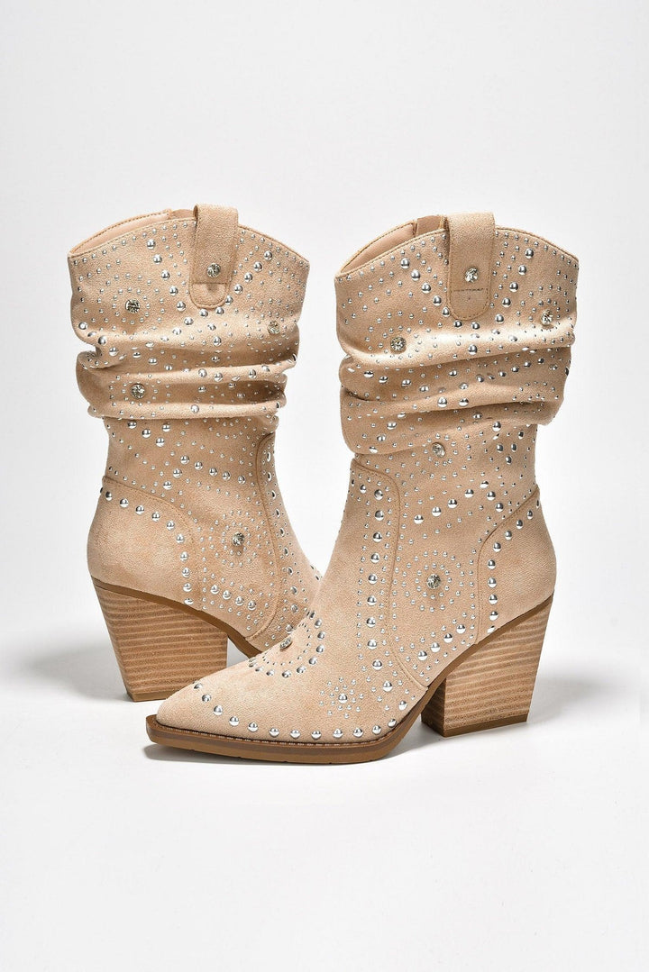 ROYA - BEIGE - BOOTS by CAPE ROBBIN closed pointy toe pull tabs stacked block heel zipper closure lightly cushioned footbed rubber outsole Cape Robbin's Roya offers a new way to rock the humble cowboy boots. Features luxe,velvety suede laced with rhinestones and studs for a shimmering final touch. The slouch bootie helps unleash your wild side.