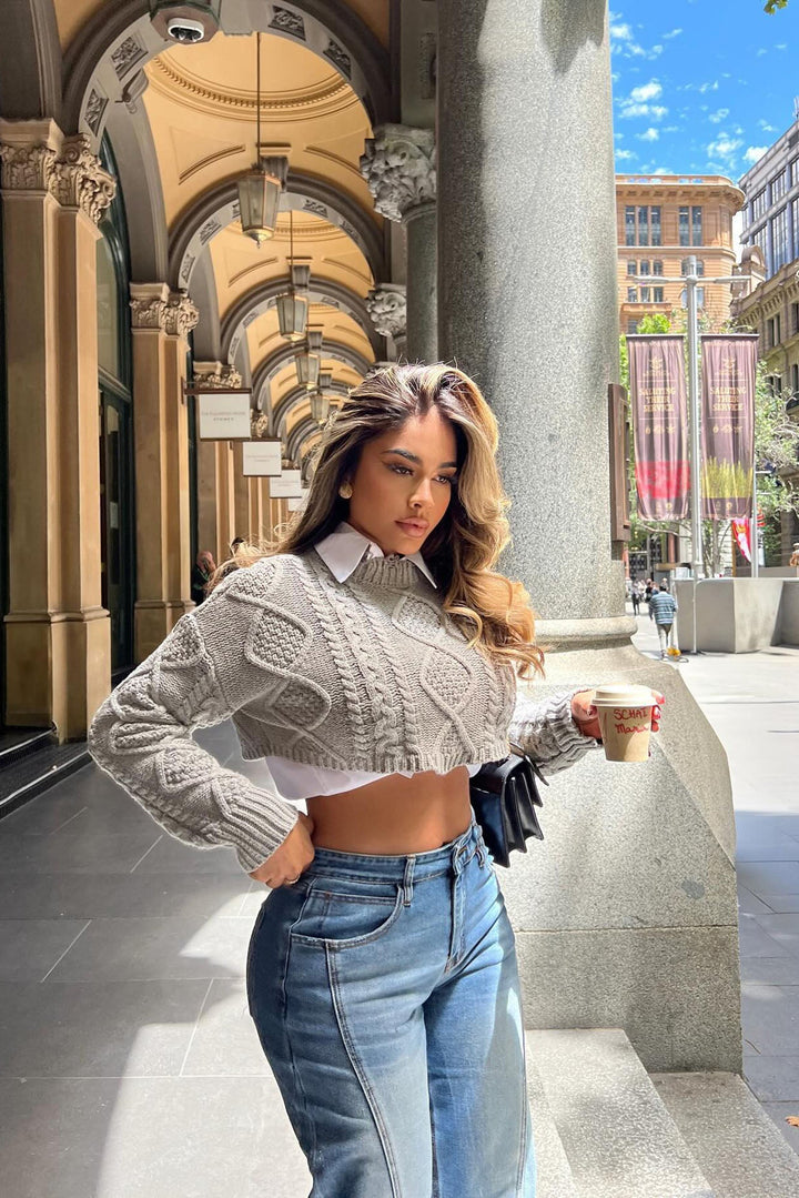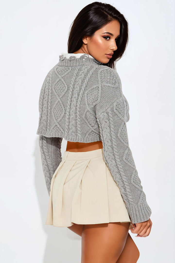 Available In Grey. | Pullover Sweater | Cable Knit | Long Sleeve | Crew Neck | Distressed | Cropped | Ribbed Hem | 50% Cotton 32% Acrylic 18% Polyester | Imported