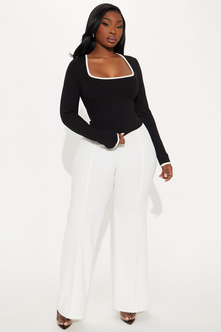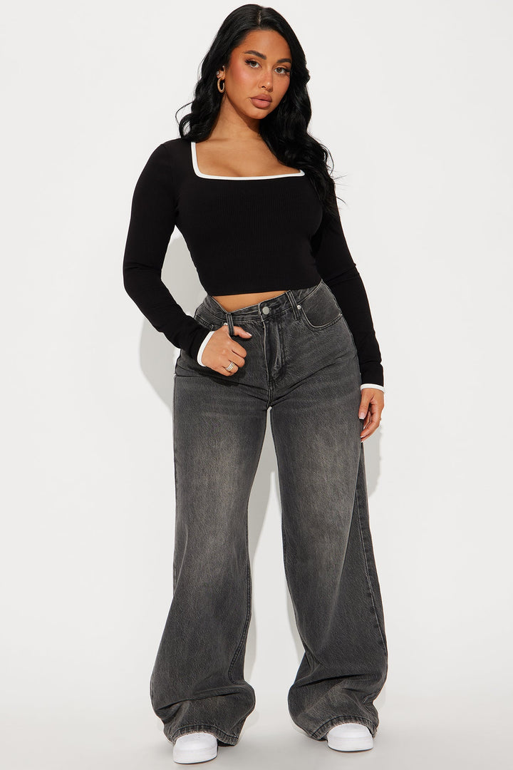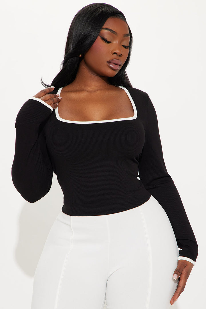 Available In Black/White And Pink. | Ribbed Long Sleeve Top | Stretch | Contrast Trim | Cropped | 91% Rayon , 9% Spandex | Imported