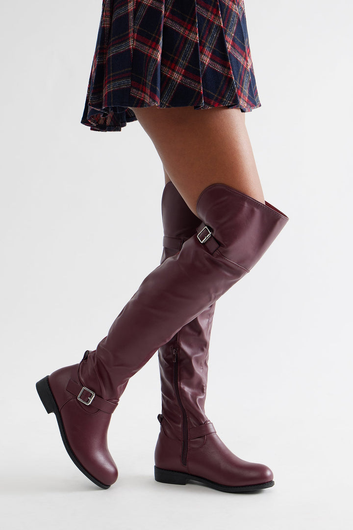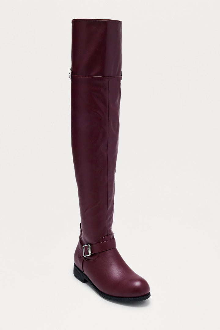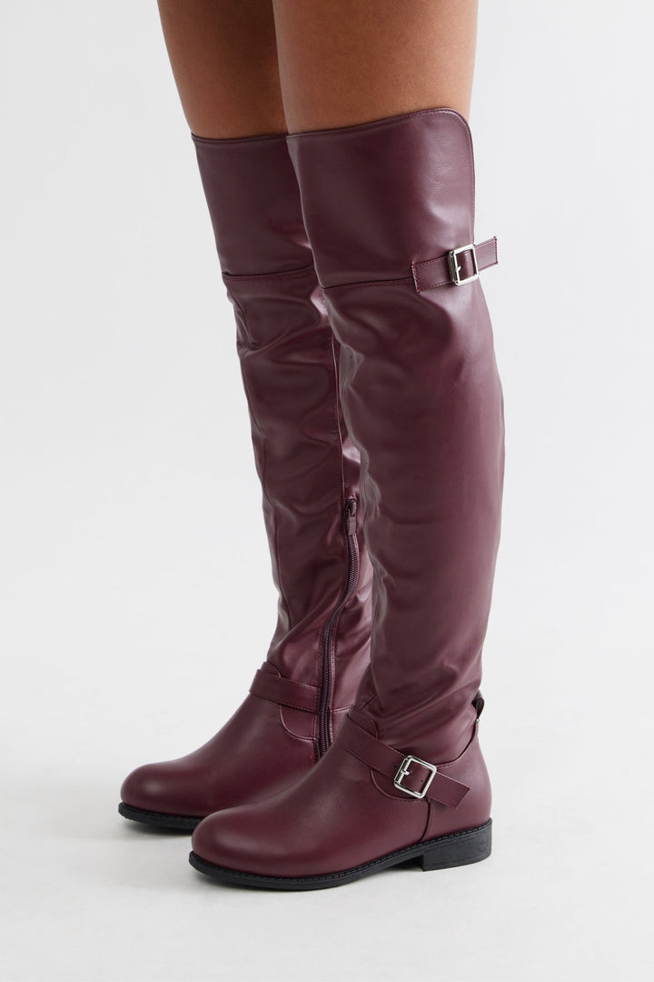 Available In Burgundy. | Thigh High Flat Boots | Hardware Detail | Round Toe | Flat Heel | Side Ankle Zipper | Imported