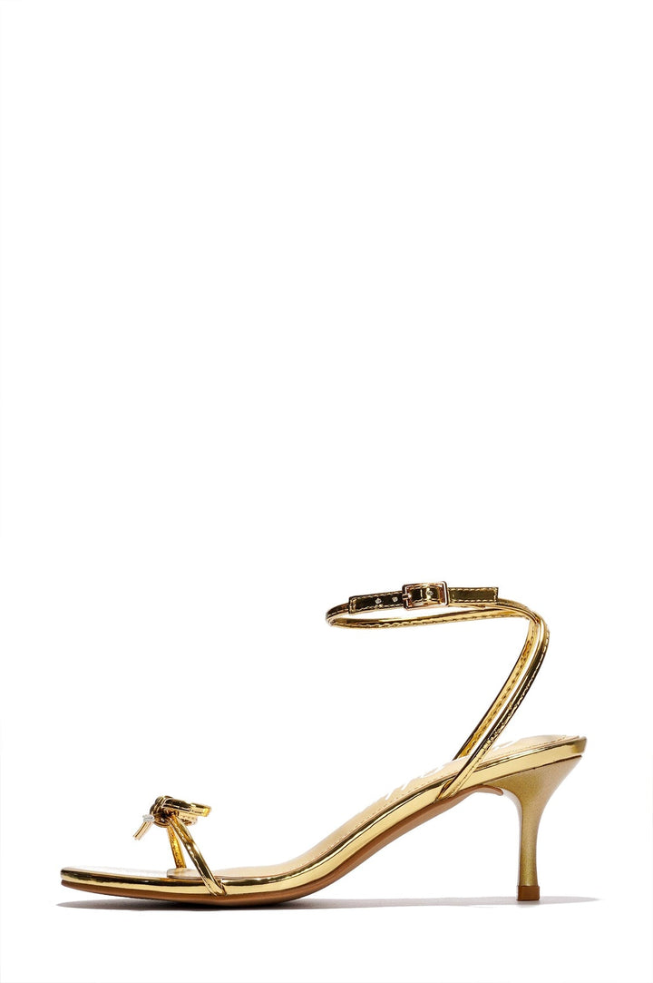 SADIE - GOLD - HEELS by CAPE ROBBIN Kitten heel: 2-inch Ankle strap PU leather insole with memory foam cushioning for added comfort Minimalist design with bow Round toe Step into elegance with the Sadie minimalist sandals, featuring a sleek design with a charming bow detail. These sandals are perfect for both casual and formal occasions. With a classic black and beige color or a trendy gold finish, they offer a playful yet elegant look. Versatile and chic, they pair effortlessly with various outfits, from jeans to dresses.
