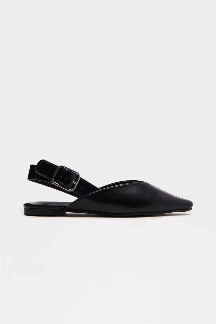 Available In Black. | Slingback Flats | Adjustable Buckle | Pointed Toe | Flat Heel | Imported