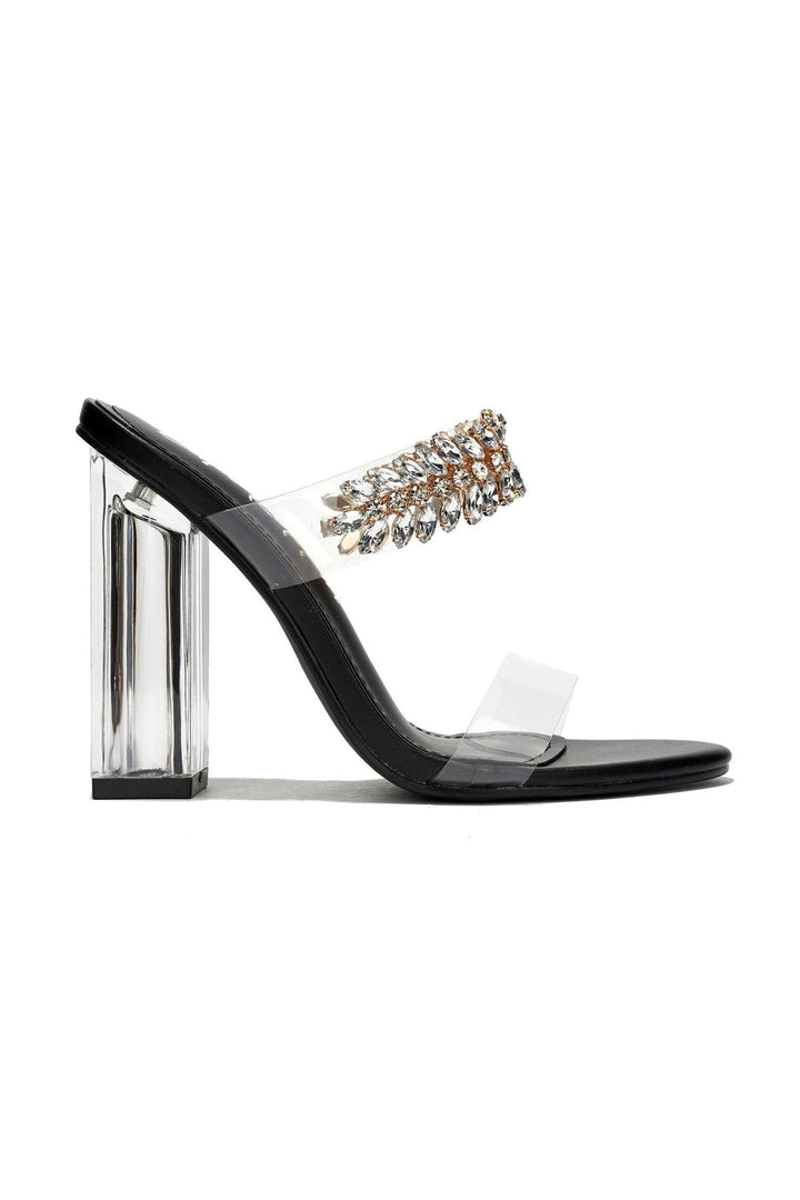 SASCHA - BLACK - HEELS by CAPE ROBBIN open round toe PU metallic embellishment lightly cushioned insole rubber outsole Add a shimmering boost to your wardrobe with Sascha's magnetic allure. Features a stylish and sturdy high-block heel and gem-adorned clear upper strap. These jaw-dropping stunners come in black,silver,or beige.