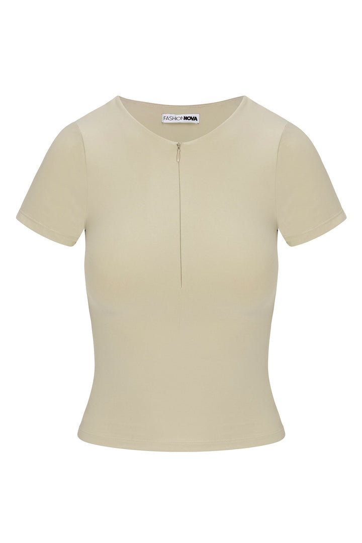 Second Skin Double Lined Zip Front Short Sleeve Top - Stone
