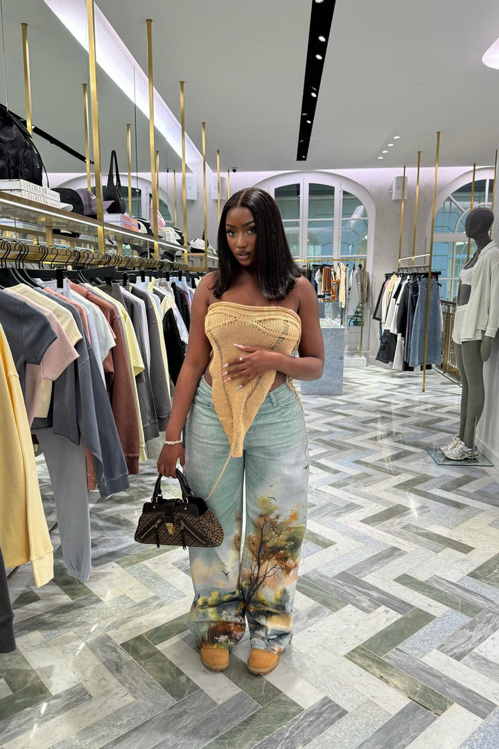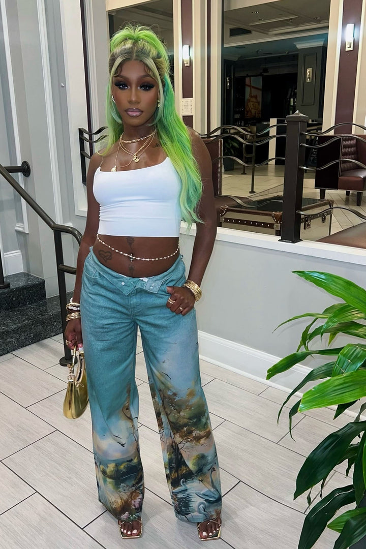 Available In Light Blue. | Wide Leg Jean | 5 Pocket | Landscape Print | 10.5" Rise | 33" Inseam | Disclaimer: Due To The Specialized Wash & Printing Process, Each Garment Is Unique. | Non Stretch, 100% Cotton | Imported