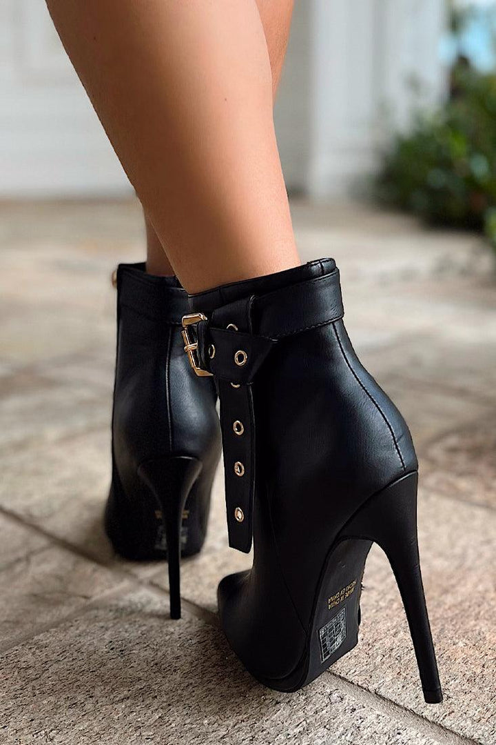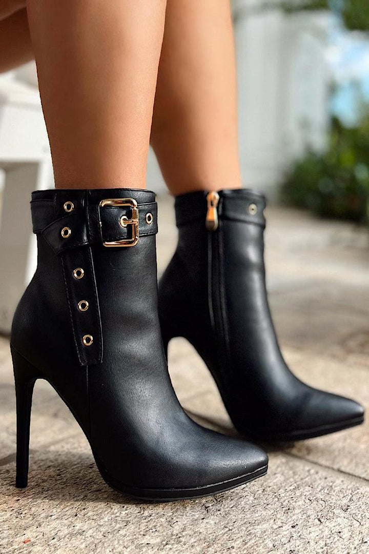 Sexy Black PU Ankle Booties With Gold Buckle featuring a 4 inch heel with zip up design making it easy to put on.