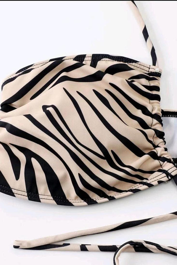 This sleek bikini and coverup set offers ultimate comfort and style. Crafted from a soft, comfortable fabric, it features a beautiful brown zebra print for a fashionable look. Perfect for poolside lounging and beach days.