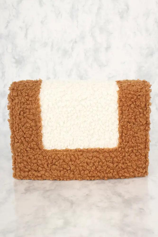 This show stopping bag is the perfect go to for a bold look! Featuring; faux leather, two tone, inner pockets, curly wool, chain strap, front clasp closure. Width: 8 inches Height: 5 3/4 inches Depth: 2 1/2 inches