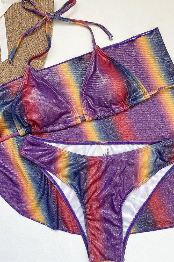 Look stunning in this eye-catching 3pc metallic bikini set. Featuring a purple rainbow design, this set includes a bikini top, a bikini bottom, and a matching skirt. With a unique, metallic sheen, this set is perfect for a night out on the town.