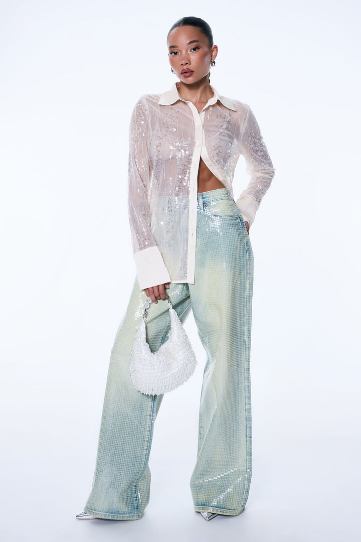 Available In Vintage Wash. | Wide Leg Jean | 5 Pocket | Clear Shine Finish | Tinted | 12" Rise | 32" Inseam | Non-Stretch | Disclaimer: Due To The Specialized Wash Process, Each Garment Is Unique. | 100% Cotton | Imported