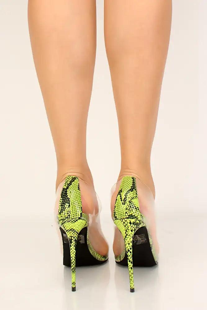 Step out in style with these baddies! Featuring; pointy closed toe, snake print, clear detail, and a cushioned foot bed. Approximately a 4 inch heel.