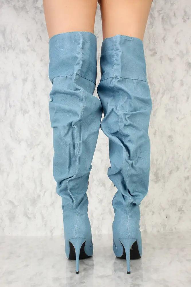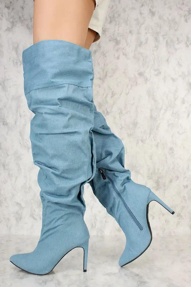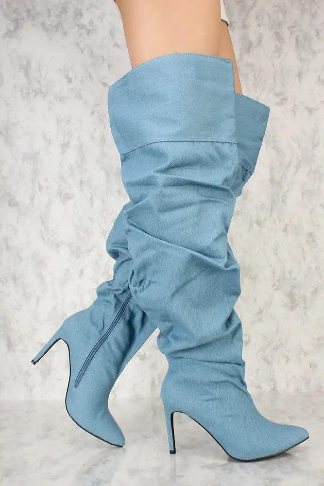 Must have chic thigh high boots! Features include, a denim fabric, pointy toe, ruched shaft, thigh high, side zipper closure, and a cushioned foot bed. Approximately a 4 inch heel, 21 inch shaft, and a 22 in circumference.