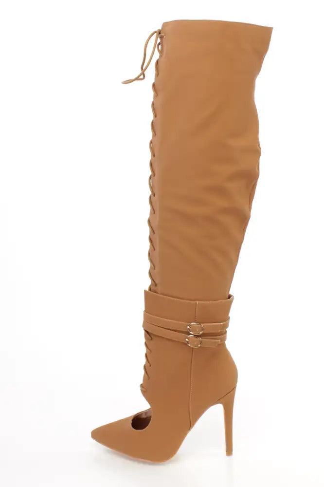 Camel Thigh High Lace Up High Heel Boots Nubuck