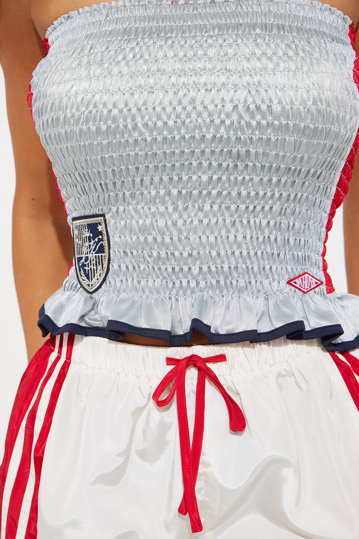 Available In Grey. | Tube Top | Straight Neck | Strapless | Front Screen | Patches Detail | Smocked Detail | Stretch | Self : 100% Polyester | Contrast 1 : 100% Polyester | Contrast 2: 95% Polyester, 5% Spandex | Imported
