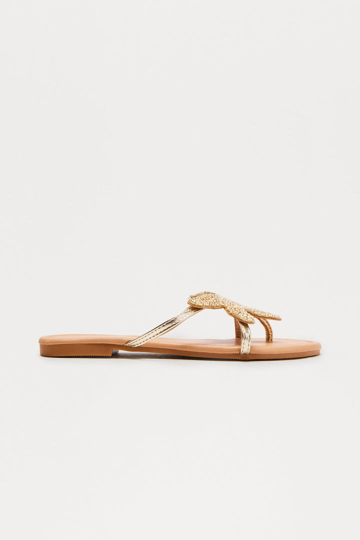 Available In Gold. | Flat Sandals | Flip Flop | Starfish Applique | Rhinestone Embellishment | Round Toe | Flat Heel | Imported