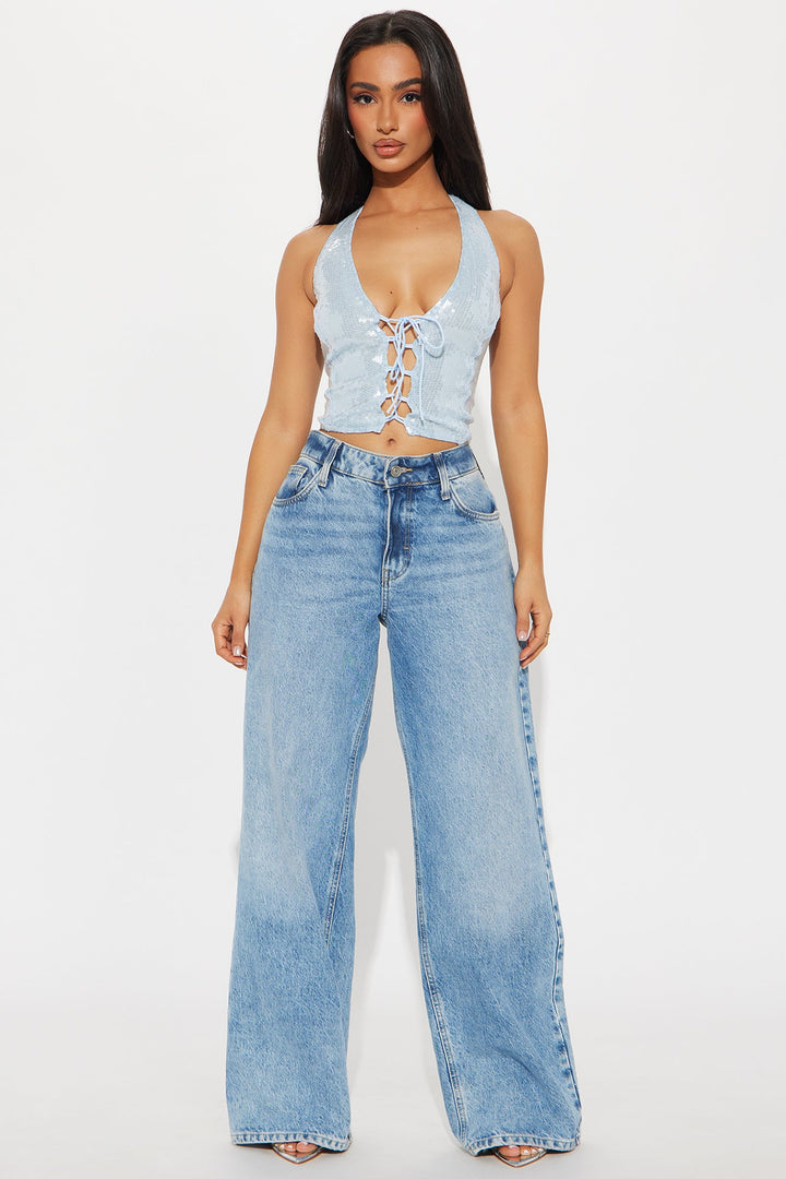 Available In Light Blue And White. | Halter Top | Lace Up | Sequin | Stretch | Self/Lining: 100% Polyester | Imported