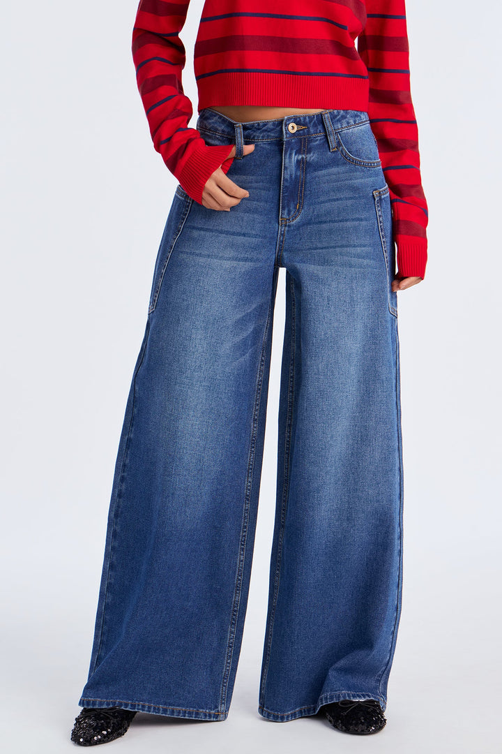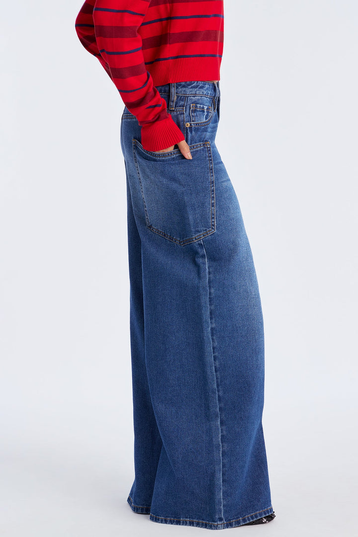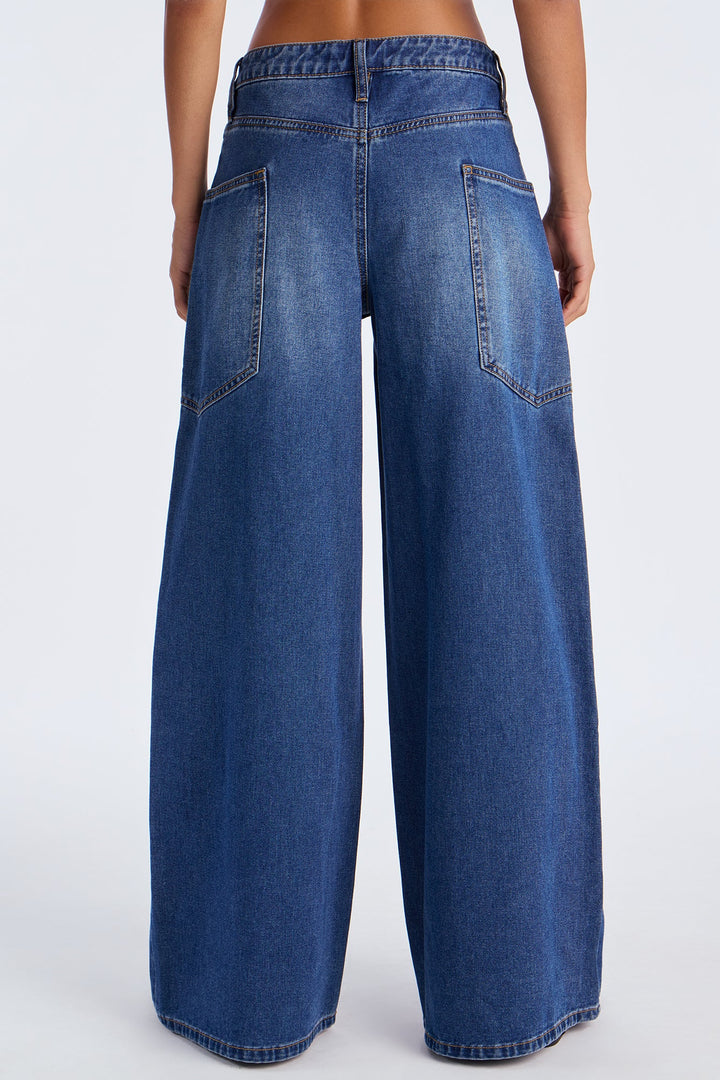 Available In Dark Wash. | Wide Leg Jean | Front Pockets | Oversized Side Pockets | Baggy Fit | Non Stretch | Button & Zip Fly Closure | 32" Inseam | 11" Rise | Self: 100% Cotton | Imported