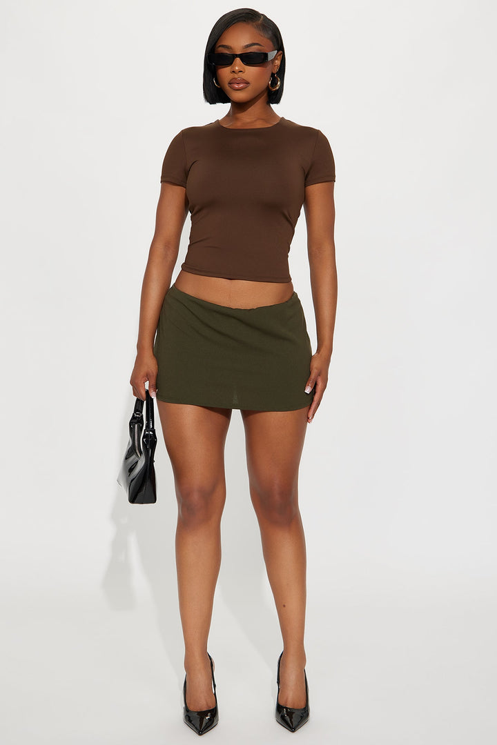 Available In Brown, Butter Yellow And White. | Baby Tee | Crew Neck | Short Sleeve | Smoothing And Shaping | Double Lined | Stretch | Self: 92% Nylon 8% Spandex | Lining: 92% Nylon 8% Spandex | Imported