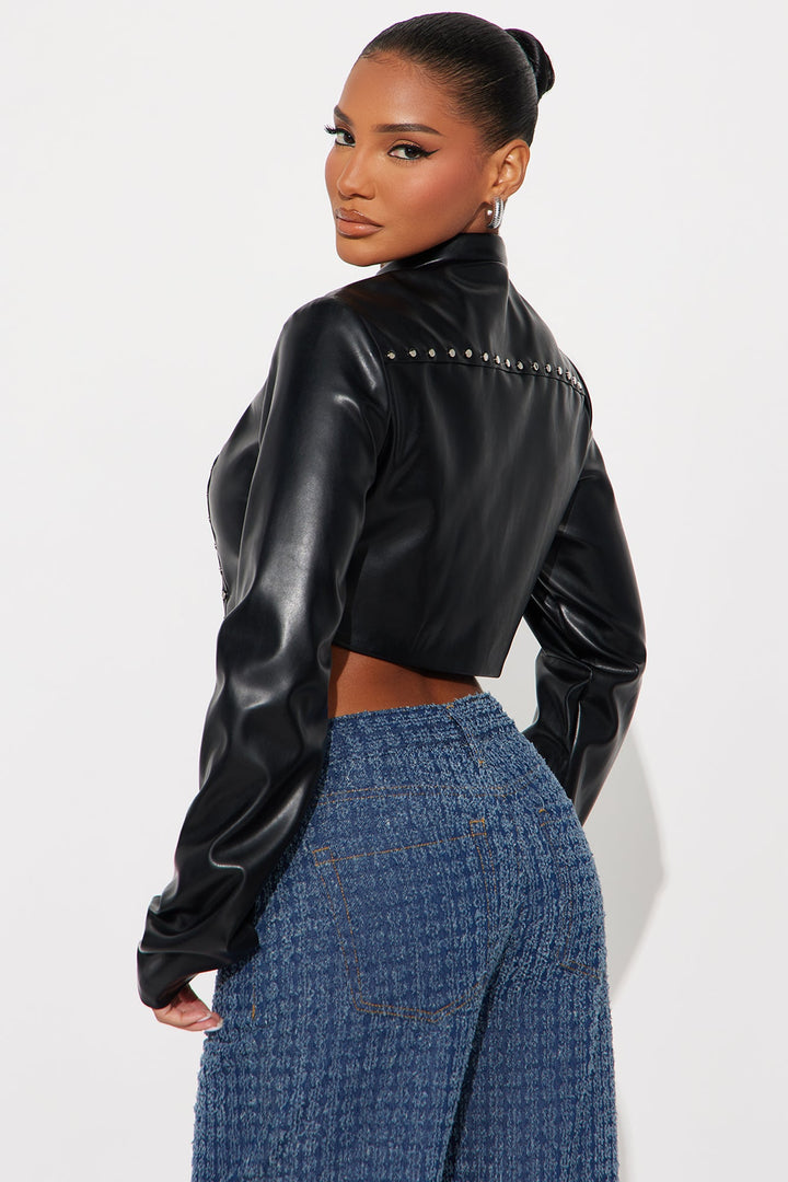 Available In Black. | Blazer | Cropped | Front Zip | Studded Detail | Fully Lined | Non Stretch | Self: 50% PU ( Polyurethane) 50% Polyester | Lining: 100% Polyester | Imported