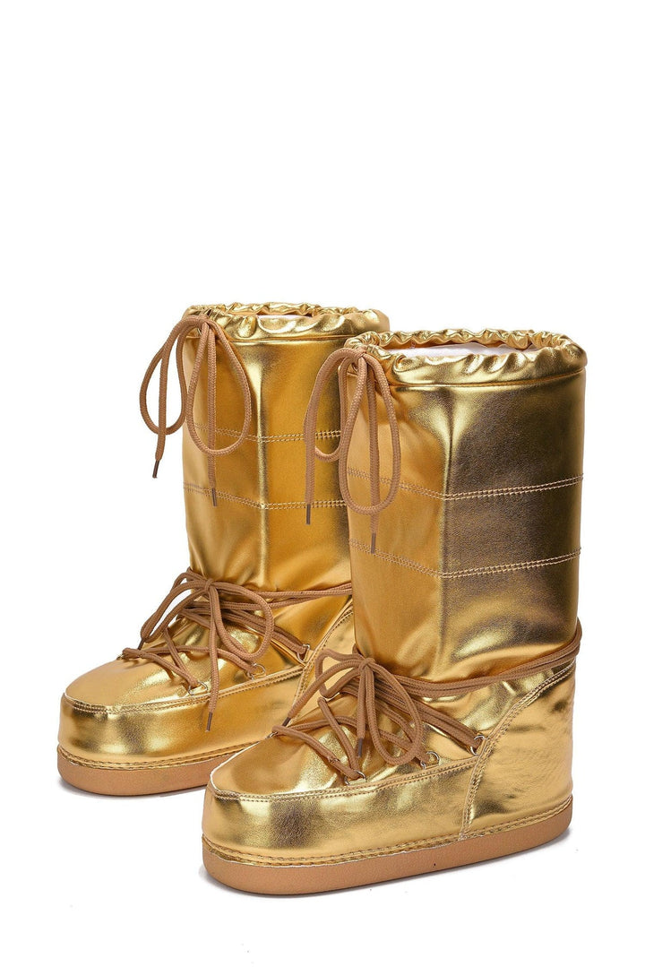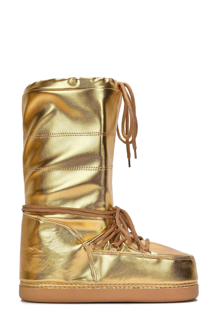 SNOWBELL - GOLD - BOOTIES by CAPE ROBBIN closed round toe calf length boots lace-up vamp patent metallic cushioned insole drawstring rubber outsole Marrying warmth and style,Cape Robbin's Snowbell is a must-have boot. These cuties feature insulation to keep your feet warm and dry in any condition.