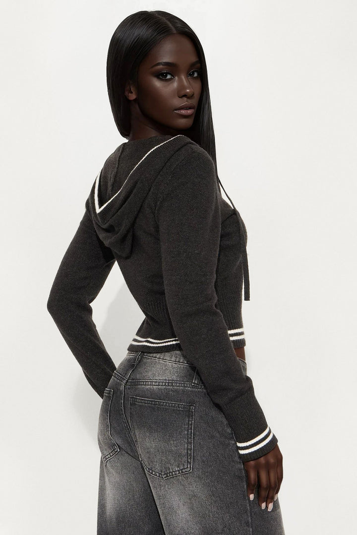 Snuggle Season Zip Front Hooded Sweater - Charcoal